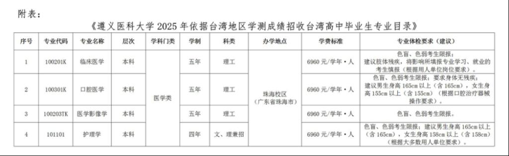 2025年学校依据台湾地区学测成绩招收台湾高中毕业生招生计划共计10人,学校将根据实际生源情况进行分专业录取,最终录取专业以公示结果及录取通知书为准。招生专业目录见附表。