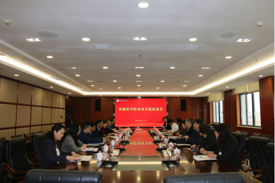 4月13日,承德医学院党委书记盛婉玉,党委副书记、院长唐世英率队来校考察,双方在行政楼五楼2号会议室开展交流座谈。taptap点点党委副书记、校长刘建国,副校长李春鸣,党委委员、副校长龚其海出席会议,党委学校办公室、人事处、科技处、发展规划处等相关部门负责人参加座谈。会议由李春鸣主持。