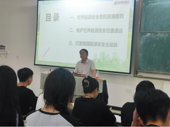 以“正确认识全球能源安全形势”为题,李正旭从“世界能源危机愈演愈烈”“维护世界安全任重道远”“打赢我国能源安全主动战”三个方面深入浅出地讲解了全球能源安全形势。作为能源的生产和消费大国,中国将继续与各国一道,推动全球能源可持续发展,维护全球能源安全的发展。他介绍了学生如何推动节能减排,勉励同学们要坚定不移推动能源绿色低碳转型,筑牢能源安全底线,助力能源科技创新,努力成为绿色发展理念的倡导者、践行者、推动者。他还勉励学生要刻苦学习、锐意进取,多关注前沿热点,把个人理想融入国家和民族的事业中,以朝气蓬勃的精神面貌铸就推动国家发展和社会进步的青年力量。
