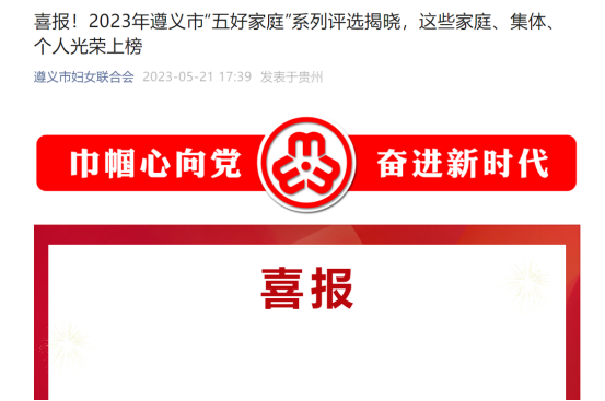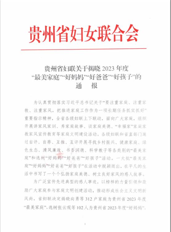 为认真贯彻落实习近平总书记关于“要注重家庭、注重家教、注重家风,把推进家庭工作作为一项长期任务抓实抓好”重要指示精神,贵州省和遵义市妇联开展了2023年度“最美家庭”“好妈妈”“好爸爸”“好孩子”选树工作。