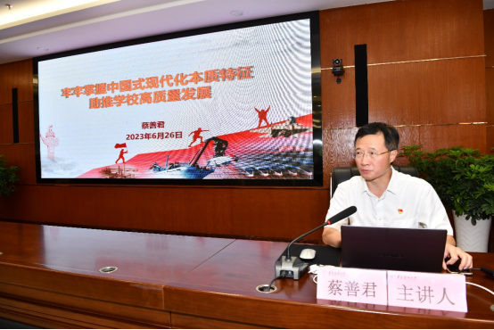 蔡善君从“领悟思想伟力,深刻认识中国式现代化的本质特征”“贯彻实践要求,全面把握中国式现代化的重大原则”“发现解决问题,全力助推学校高质量发展”三个方面系统讲解。他指出,坚持和加强党对中国式现代化的领导,中国共产党是中国式现代化的最高政治领导力量,也是中国式现代化沿着中国特色社会主义道路继往开来、赓续推进的根本保证。坚持走符合国情的中国式现代化道路,中国式现代化既有各国现代化的共同特征,更有基于自己国情的鲜明特色,要持以高质量发展推进中国式现代化。