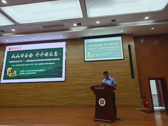 本次讲座特邀遵义市公安局新蒲分局大学城警务站站长程远富警官宣讲《易制爆危险化学品治安管理办法》(中华人民共和国公安部令第154号)在内的易制毒、易制爆危险化学品法律法规。贵州省望江气体有限责任公司安全负责人,高级工程师钟光岚进行了实验室气体气瓶安全培训,利用气瓶、压力表等现场教具,从气体气瓶的使用、运输、贮藏及事故处理等方面进行了全方位的讲解培训。设备处实验室安全管理科科长王森教授解读了《高等学校实验室安全检查项目表(2023)》,并从学校、实验室和具体操作人的角度对实验室安全工作的现状及问题进行了剖析。