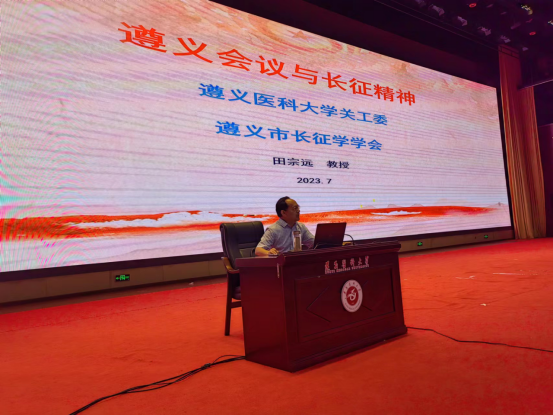 学校党委讲师团成员田宗远教授以“遵义会议与长征精神”为题,在学校会堂为1800余名军训学生代表作专题讲座。田宗远以风趣幽默的语言、如数家珍的案例,详细阐释了遵义会议及其前后的一系列会议的历史背景、深刻意义、重要启示以及对长征精神和遵义会议精神的传承。他呼吁当代大学生要传承红色基因,赓续红色血脉,脚踏实地为社会主义事业贡献青春力量。