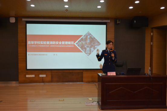 新蒲新区消防救援大队参谋罗艺对《高等学校实验室消防安全管理规范》进行了解读,她以实验室消防安全为切入点,深入浅出地向师生讲解日常实验过程中的注意事项及在紧急情况下的灭火方式选择、火灾规避方法等重要内容,具有极强的现实与指导意义。随后,在罗艺的指导下开展了消防安全演练活动。