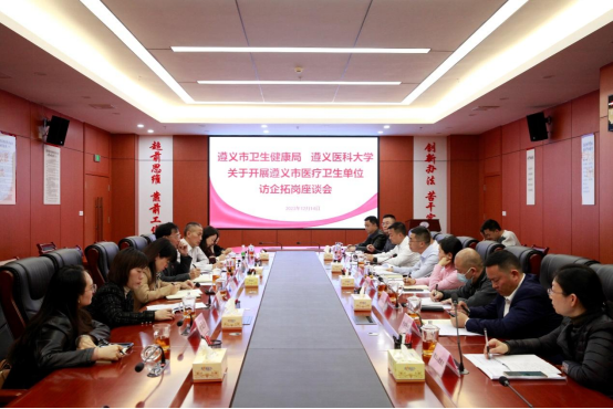 为精准对接企业用人需求,拓宽毕业生就业渠道和岗位资源,全力促进2024届毕业生更充分更高质量就业,12月14日,学校党委副书记、校长刘建国一行与遵义市卫生健康局召开座谈交流会。遵义市卫生健康局人事教育科、遵义市卫健局直属医院(6家)及学校研究生工作部(研究生院)、第一临床学院、口腔医学院、护理学院代表人员参加。会议由遵义市卫生健康局党委副书记、副局长段永华主持。