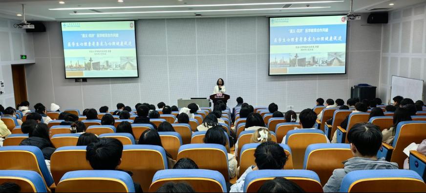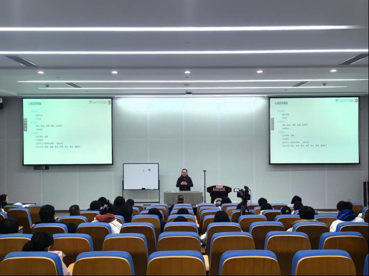 12月26日上午,上海同济大学附属同济医院教务处副处长黄蕾受邀向学校临床医学、精神医学等医学专业的160余名医学生作题为《医学生心理素质要求与心理健康促进》的专题讲座,讲座由教育教学质量控制中心副主任王曜晖主持。