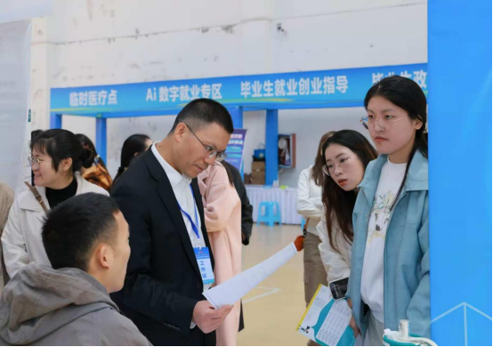 本次招聘会得到遵义市人力资源和社会保障局的大力支持。现场特别设置了AI 数字就业服务专区、政策咨询窗口以及就业创业指导专区,并邀请专业导师为学生提供简历优化、面试技巧等针对性指导服务,吸引了大批研究生驻足咨询。据初步统计,本次招聘会共收到求职简历1100余份,组织面试460余人次。