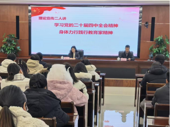 宣讲会上,两位老师以“一人讲理论、一人讲实践”的方式展开。周小艺系统梳理了党的二十届四中全会的召开背景、重大意义和核心内涵。韩文勇结合自身多年教育教学经历,从启智润心的教育理念、因材施教的教学方法等方面,对教育家精神进行了生动阐释。