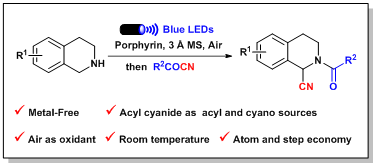 N-酰基-1-氰基四氢异喹啉是一类重要的药物分子骨架和医药中间体。目前,对于该类分子的合成存在需使用当量的化学氧化剂、高毒氰基化试剂以及反应路线冗长等问题。针对上述不足,该研究团队在绿色、低碳、高效的发展理念引领下,开发出基于光氧化还原和Reissert类反应的一锅高效合成N-酰基-1-氰基四氢异喹啉的方法。该方法反应条件温和,操作简便,在蓝光照射下仅需空气作为氧化剂。同时,以酰基腈作为酰化试剂和氰基源,一方面避免了高毒性氰基化试剂的使用,另一方面使反应具有更高的原子和步骤经济性。总体来说,该项研究为N-酰基-1-氰基四氢异喹啉类化合物的合成提供了一种更加绿色、高效的合成路线。(审核:一审陈永正、二审杨清玉、三审李均,图文:教务处)
