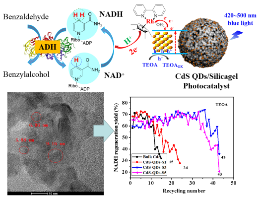 烟酰胺腺嘌呤二核苷酸(NADH)是许多氧化还原酶催化反应过程中的关键辅助因子,但由于其高成本和化学计量消耗,需要原位再生NADH辅酶来保持氧化还原酶催化反应的可持续发展与应用。其中最行之有效的方法之一是构建可见光驱动的NADH原位再生体系。基于此,本研究采用连续离子层吸附反应和高能球磨分散方法,构建了一种嵌入式硫化镉量子点/硅胶复合光催化材料,实现了可见光驱动的NADH高效原位再生。所构建的硫化镉量子点/硅胶复合材料具有0.92 ev的带隙,远低于块体硫化镉的带隙。硫化镉量子点/硅胶复合材料的光敏度是块体硫化镉的31倍。得到的硫化镉量子点/硅胶复合材料在12 min内实现产率为68.8%的高效NADH再生,并可以重复使用40多次循环。(审核:一审李晓、二审杨清玉、三审李均,图文:贵州省生物催化与手性药物合成重点实验室)
