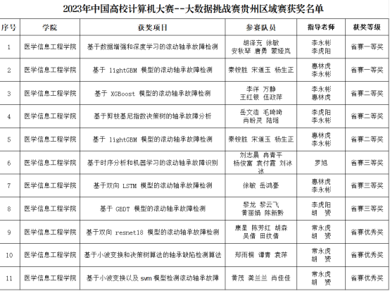 本届大数据挑战赛以“贵州省工业大数据——滚动轴承故障的检测诊断”为题,以工业大数据技术为核心内容,重点考查参赛选手基于Python环境下,利用数据探索、数据处理、数据分析、数据挖掘、机器学习等相关技术,解决实际问题的能力。大赛经报名、审核、专家评审等环节,全省共评出一等奖8项、二等奖8项、三等奖10项、优秀奖7项。taptap点点医学信息工程学院李永彬老师指导的“基于数据增强和深度学习的滚动轴承故障检测”项目和惠林虎老师指导的“基于lightGBM模型的滚动轴承故障检测”项目荣获省赛一等奖。