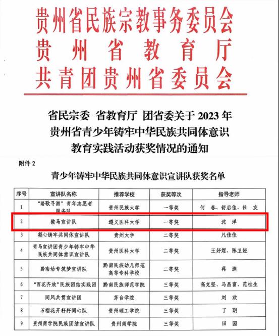 学校党委全面落实立德树人根本任务,推动理论宣讲走深走实,“三全育人”工作取得显著成效。“骏马”宣讲队自2022年组建开始,得到学校党委宣传部、党委统战部和团委等多部门关心支持。马克思主义学院高度重视团队选树和培育,由贵州省青年讲师团成员、马克思主义学院副院长沈洋担任第一指导教师,2022级思想政治教育专业研究生姚雯竞担任队长,积极探索创新宣讲方式,增强宣讲效果,扩大宣讲覆盖面,持续推动党的二十大精神、党的民族政策以及党的最新理论成果飞入“寻常百姓家”,让中华民族共同体意识深入校园、走进社区、融汇各族人民群众内心深处,为民族团结进步工作发出遵医声音、贡献青春力量。(审核:一审邢瑞娟,二审上官腾飞,三审杨清玉、李均 ;撰稿人:郭晓翠、秦朝燕)