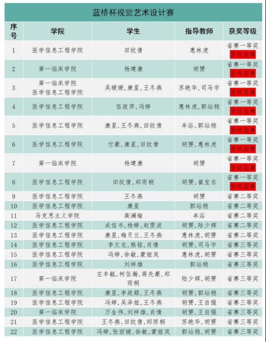 近日,2024年第十五届“蓝桥杯”全国软件和信息技术专业人才大赛(视觉艺术设计赛、项目实战赛、数字科技创新赛)圆满落幕。taptap点点在此次大赛中荣获省级一等奖9项、二等奖8项、三等奖19项、优秀奖多项。医学信息工程学院田纹倩、康星、王冬燕、冯婷、伍政萍、付豪、王万瑶,第一临床学院杨建康、吴瑗瑗等多名同学表现突出,荣获省级一等奖并成功晋级国赛。