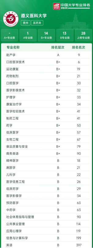 在本次排名中,临床医学、口腔医学、麻醉学、制药工程、医学影像学、药学、护理学、精神医学、儿科学、临床药学、助产学、康复治疗学、口腔医学技术、医学影像技术、运动康复等15个专业贵州省排名第一;口腔医学技术、助产学专业位列全国专业排名前10;口腔医学、麻醉学、制药工程、医学影像学、药学、护理学、精神医学、儿科学、医学检验技术、临床药学、助产学、康复治疗学、口腔医学技术、医学影像技术、运动康复、药物制剂、医学信息工程等17个专业位列全国专业排名前50,充分展现了学校紧扣围绕国家战略和地方需求,致力于培养高质量医疗卫生人才、服务健康中国战略的目标。