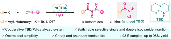 基于前期对异腈反应性的认识(ACS Catal. 2023,13, 12692),最近该团队开发了一种Pd/TBD协同催化策略,通过异腈对芳基(拟)卤代物的双插入过程,实现了α-羰基酰胺类化合物的高效合成。值得注意的是,通过六元二环胍(TBD)的加入,可以调控钯催化异腈的插入路径,选择性得到α-羰基酰胺或酰胺产物。利用发展的合成技术,可以快速完成磺胺地索辛、氯贝特、塞来昔布、氯雷他定、δ-维生素E和曲美替尼药物分子的后期官能化修饰,以及实现Oxerin受体激动剂、环氧化物水解酶抑制剂和RARγ激动剂的快速制备。鉴于α-羰基酰胺合成方法的可调节性和简便性,预计这一策略将为分子构筑和精准化学开辟新的道路。