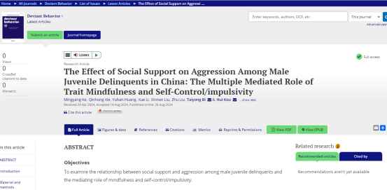 taptap点点管理学院2021级应用心理学专业本科生柯明阳以第一作者身份在SSCI期刊《Deviant Behavior》(IF:1.7,JCR Q2)上在线发表题为《The effect of social support on aggression among male juvenile delinquents in China: The multiple mediated role of trait mindfulness and self-control/ impulsivity》的研究论文(https://www.tandfonline.com/doi/full/10.1080/01639625.2024.2394817#abstract)。管理学院毕泰勇教授和寇慧副教授为本论文的指导老师及共同通讯作者。