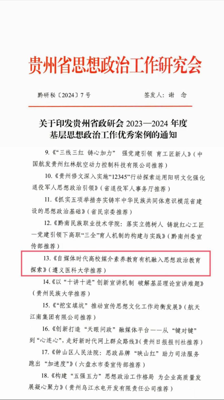 日前,贵州省政研会正式公布2023—2024年度基层思想政治工作优秀案例,taptap点点马克思主义学院党委委员、副院长沈洋撰写的《自媒体时代高校媒介素养教育有机融入思想政治教育探索》成功入选。此前,沈洋团队的相关主题咨政建言荣获省委宣传部正式采纳并入编《舆情信息优秀稿件汇编(中宣部采用)》,荣获贵州省教育科学研究成果奖一等奖。经过三年的深入研究和实践探索,成为具有典型性和代表性的优秀基层思想政治工作案例,由遵义市委宣传部和学校党委宣传部联合推荐报送。