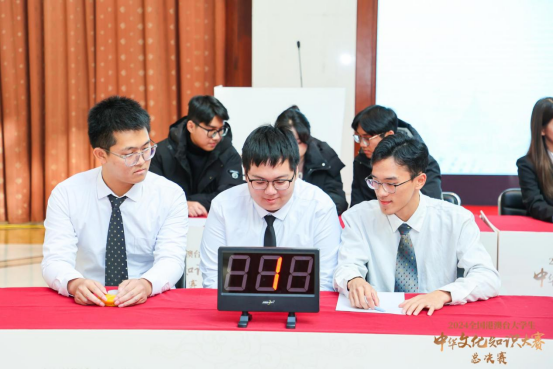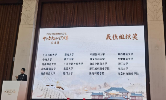 全国总结赛包括必答题和抢答题两个部分,分为“先声夺人”“抢滩登陆”“险中求胜”三个环节,题目涵盖了中华传统文化的多个领域,从历史知识、文学艺术和传统习俗等多方面考察参赛学生的中华文化素养和知识底蕴。经过半决赛和总决赛的激烈角逐,“遵医仁心队”在与浙江大学、南开大学、厦门大学、中南大学等优秀参赛队伍同台竞技中表现突出,以丰富的知识储备和扎实的传统文化基础,最终斩获总决赛第一名的好成绩,教育部港澳台办公室一级调研员刘海峰为taptap点点代表队颁奖。