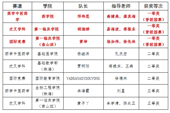 第十一届医创赛药学中医药学、交叉学科、国际竞赛全国复赛获奖名单
