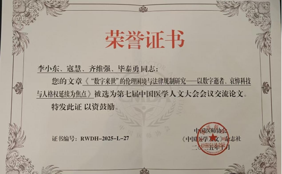 本届大会由中国医师协会《中国医学人文》杂志社主办,广东省医师协会人文医学专业委员会协办,深圳市人民医院承办,以“牢记医学使命,恪守职业精神”为主题,吸引了来自全国医学人文领域的资深专家与青年学者参会。李小东的研究聚焦数字时代医学人文伦理的前沿议题,通过对数字逝者、哀悼科技与人格权延续等问题的系统分析,提出了数字时代人文伦理治理的思考路径。其研究不仅获得与会专家一致肯定,也体现出研究中心在跨学科和新兴议题研究方面的创新优势。