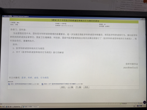 四是坚持宣传引导先行,营造良好科研诚信氛围 全方位加强科研诚信宣传。充分利用科研工作交流群、医院OA网等平台,定期加强科研诚信宣传教育。同时,对相关主管部门要通报的违反科研诚信反面案例加大曝光力度,发挥警示教育作用,加强典型宣传,大力宣传科研初心、德学双馨的专家学者,广泛开展以科学精神、科学道德、科研伦理、学术规范为内容的宣讲教育。
